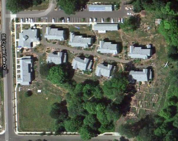 At first, the date the image was taken wasn’t clear, but CoHoots were able to date it by CoHo features–the northside fence was up, but the solar panels on the living units were not (they were installed last fall).