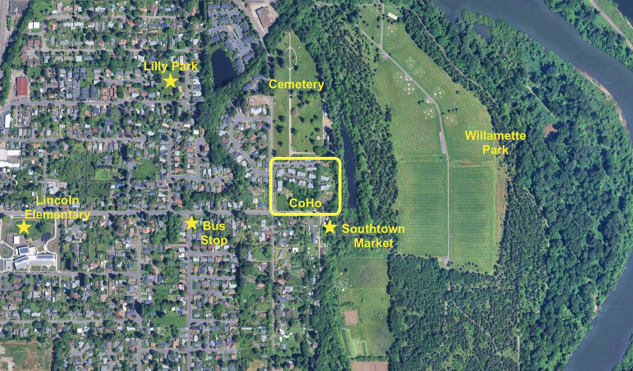 CoHo Ecovillage is located is Southtown Corvallis, near lovely neighborhood parks, huge green spaces, right next to the Willamette River.
